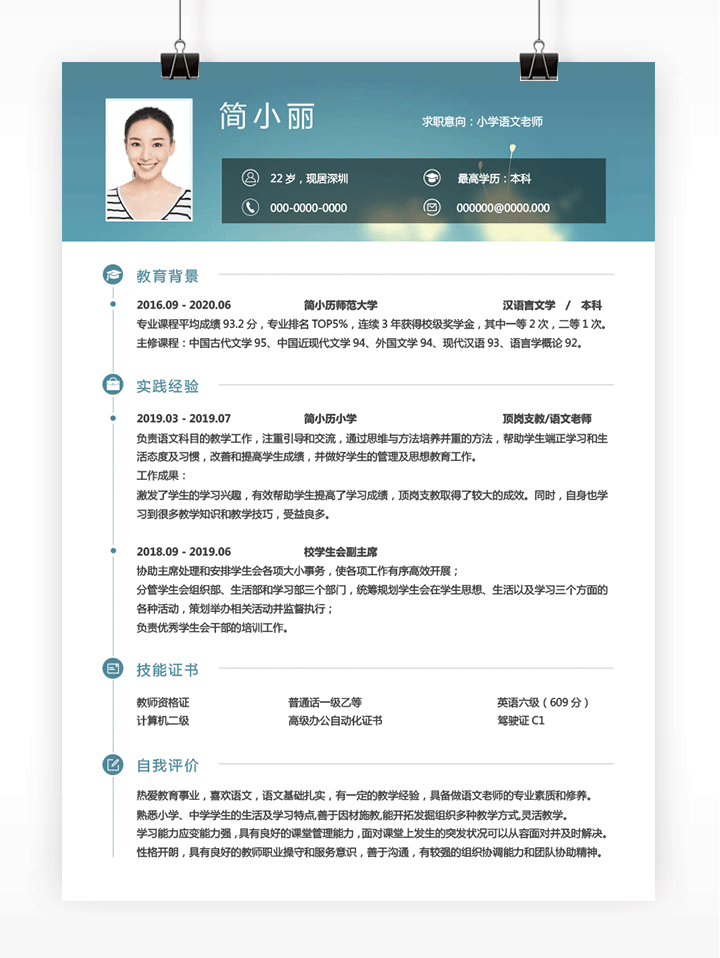 教师资格证、 普通话一级乙等、 英语六级(609分)